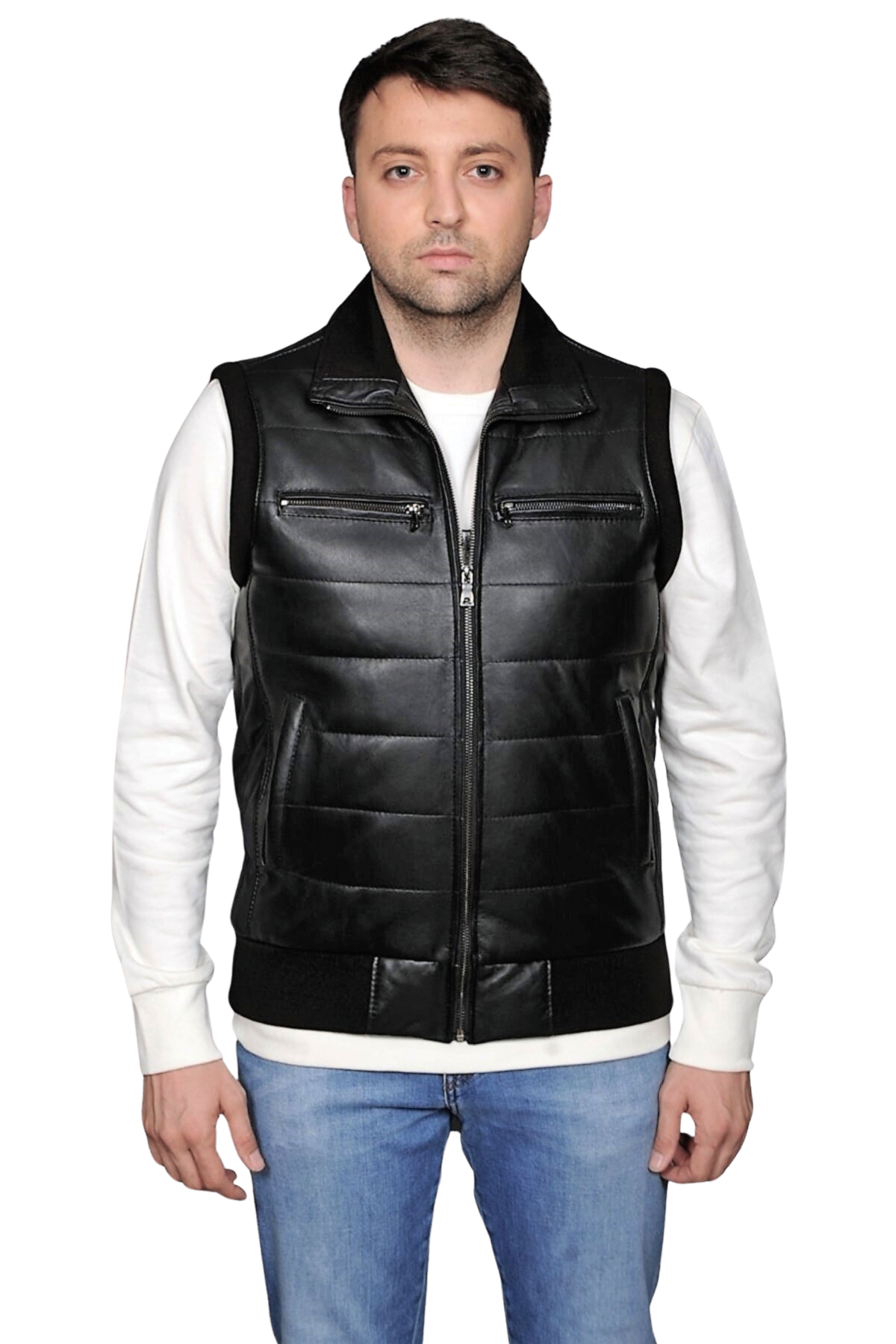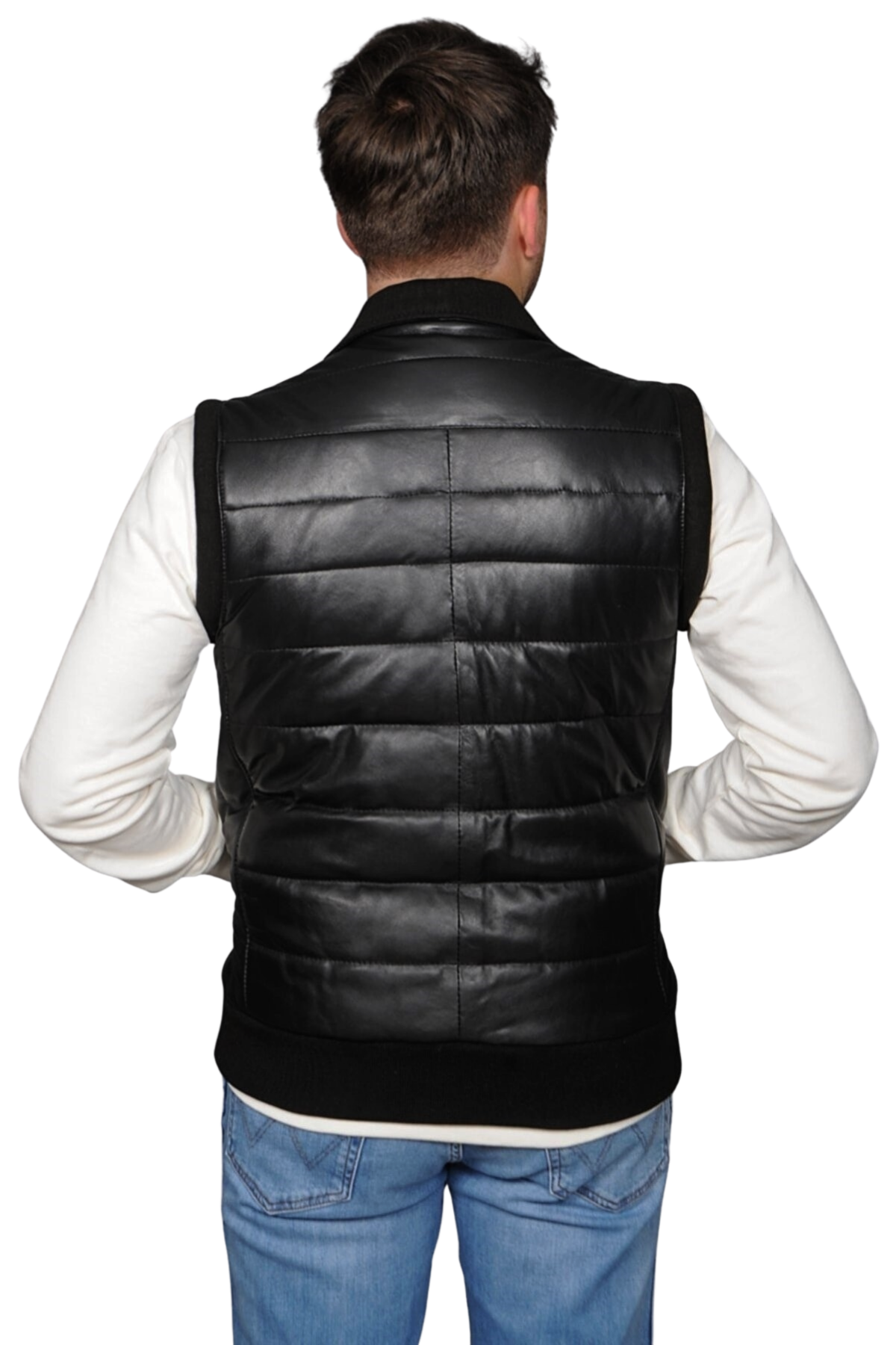 Hakiki Deri Erkek Siyah Triko Detaylı Şişme Yelek