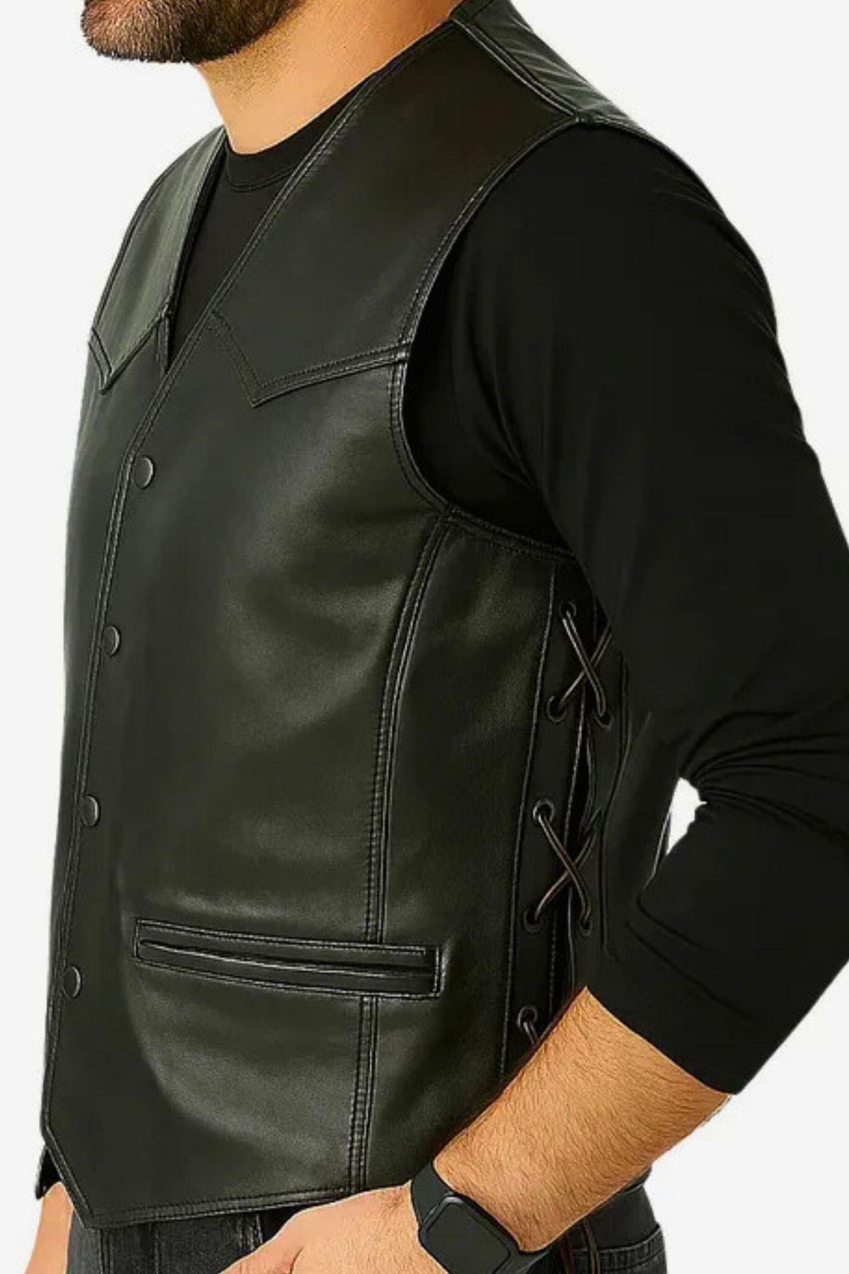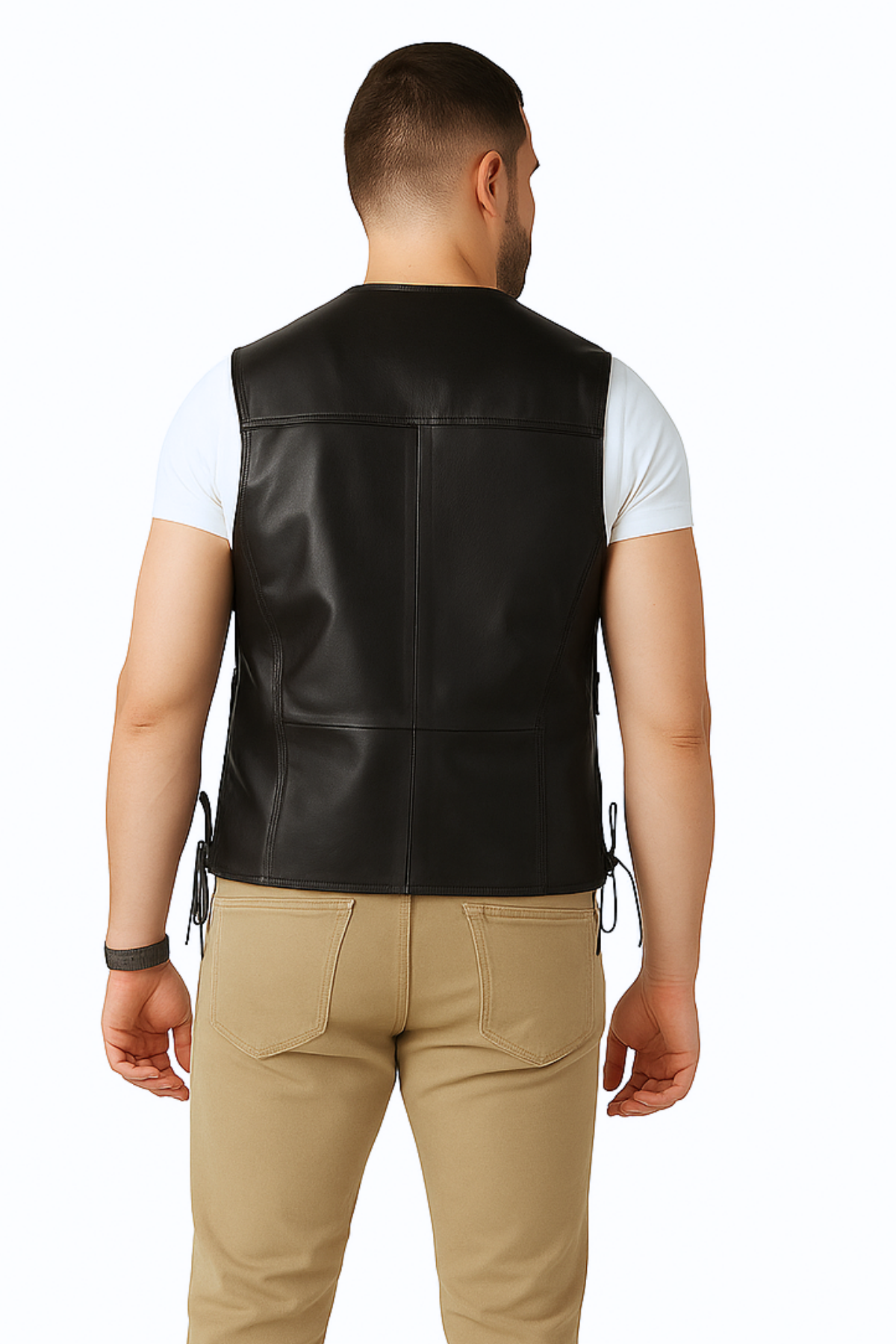 Hakiki Deri Siyah Motorcu Yeleği – Çıtçıtlı ve Bağcıklı Erkek Model