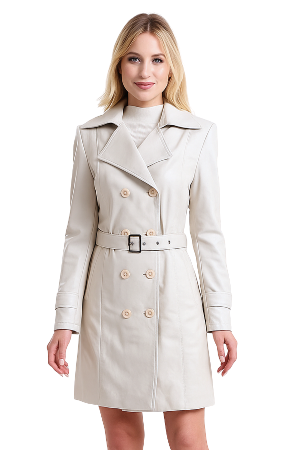 Öne Çıkan Özellikler: %100 hakiki deri, Çift sıra düğme detaylı ön kapama, Ayarlanabilir kemer ile bel vurgusu, Ekru rengiyle modern ve sade görünüm, Diz üstü uzunluk, Özel iç astar ile konforlu kullanım, Gündüzden geceye şık geçiş.