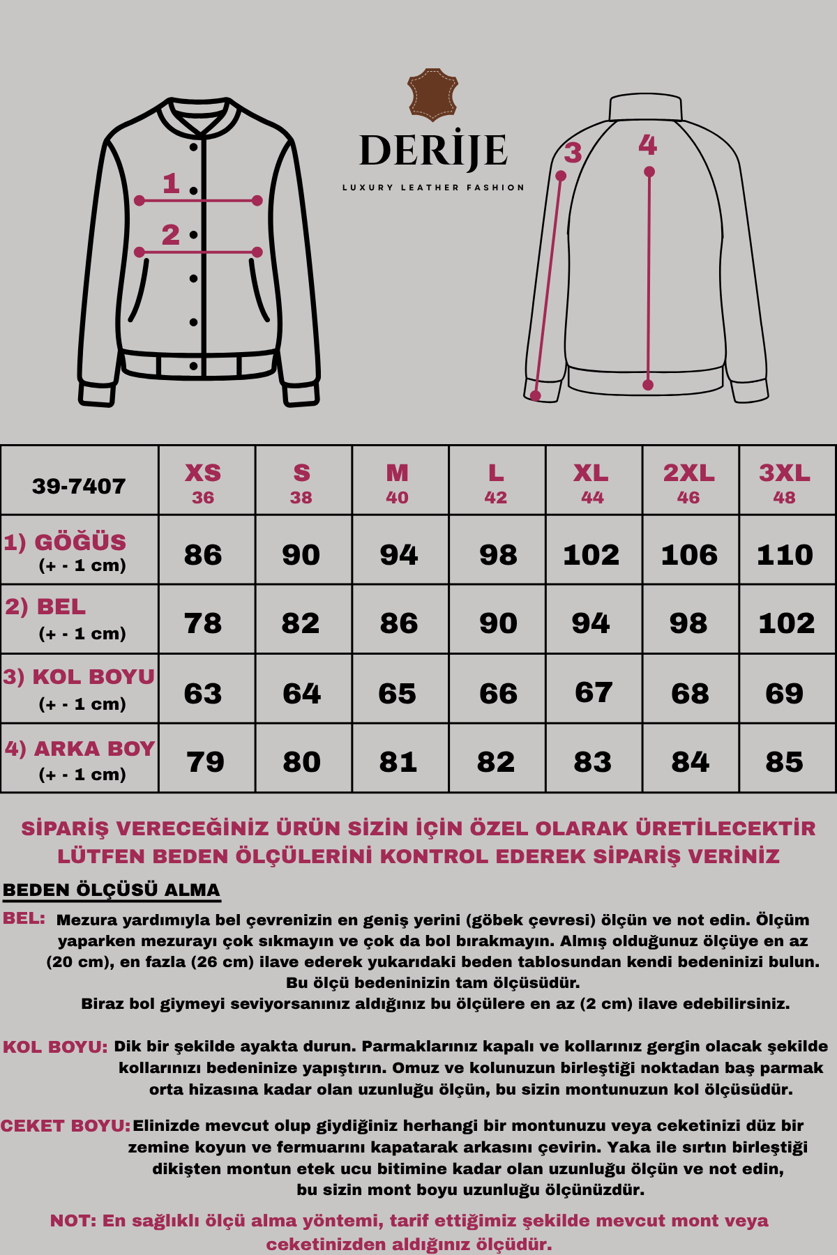 Model Ölçüleri: Boy:1,77 cm Göğüs: 90 cm Bel: 62 cm Basen: 94 cm Model üzerindeki beden : M